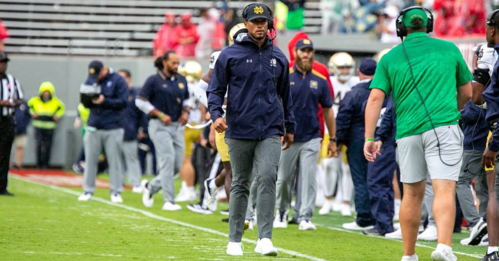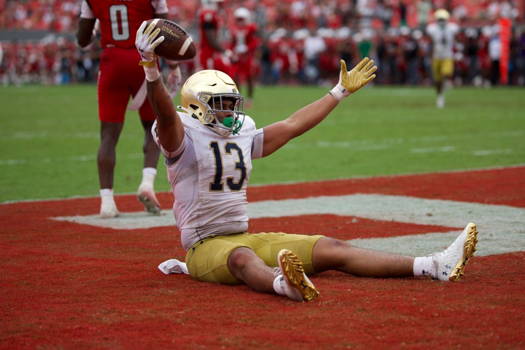 Week three is in the books and the Notre Dame Fighting Irish are a perfect 3-0. Their latest win came in their biggest test to date, a road trip to Raleigh, NC to face the NC State Wolfpack. The 45-24 win wasn’t always pretty, but frankly that’s a good thing, this team needed to face adversity before they got into the meat of the schedule. Of course, adversity is only good if you overcome it, and that they did. For the second straight time in this series, Carter Finley Stadium was hit by a storm right out of Caddyshack, which caused a two-hour weather delay. My advice to fans planning to go to the next matchup in 2029…bring a poncho. There is a lot to break down, so let’s dive into this rainy road win!