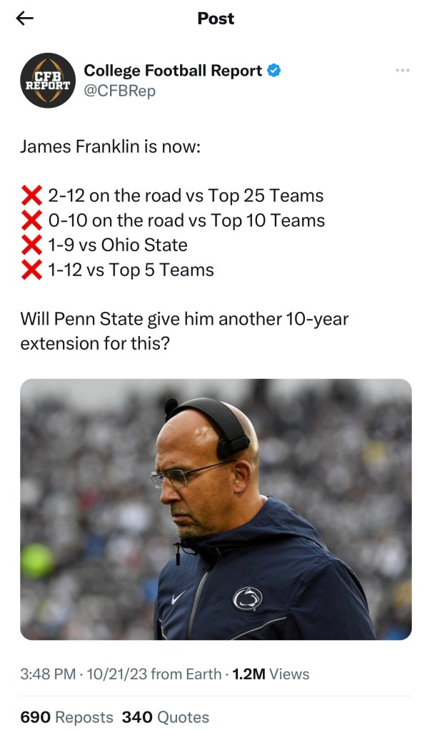 The Buckeyes most recent win came over Penn State, who turned in another typical Penn State performance in a big game. While their defense is elite, the offense was poor and the coaching staff was worse. James Franklin has turned in some ghastly numbers against the best of the best over his career. I’ll give him this, he does one hell of a Brian Kelly impression.