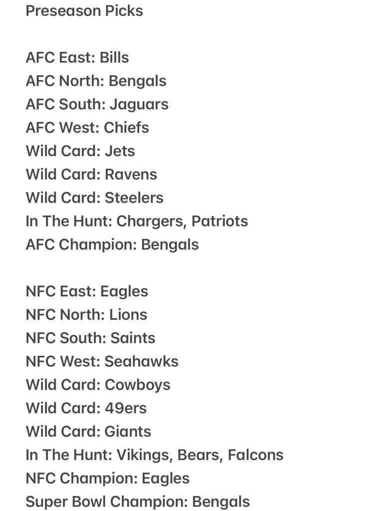 Never a good sign when your Super Bowl Champion is eliminated before the playoffs even begin but my Bengals pick was always in trouble once Joe Burrow got injured in training camp. I wound up overestimating the New York teams and didn’t give the Packers or Ravens enough credit. The Rams weren’t even in the hunt for me, but I don’t think I’m alone on that front. Patriots in the hunt and no Dolphins…less said about that the better. You win some you lose some folks. Now, let’s get to the Wild Card Round!