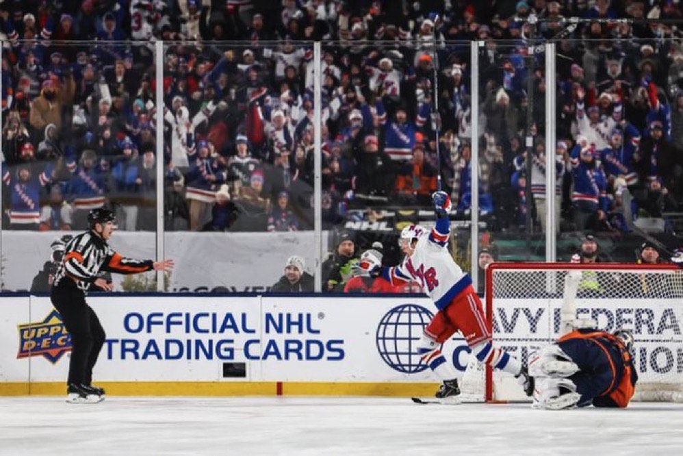 Now to the magical night that was the game itself. I braved the balmy conditions with my girlfriend (and content creator) Briana and two of my oldest and most passionate Ranger fan friends Derek and Anthony. We were fortunate early on to be sitting on the sunny side of the ice and we got the blood pumping early after Erik Gustafsson’s blast beat Sorokin. The excitement of the opening goal was only enhanced from there as rookie Matt Rempe had an epic debut bout with Islanders goon Matt Martin. Rempe’s bruising reputation preceded him and he more than held his own against the veteran fighter, as they fought to a draw. My bias gives the win to the rookie, and his teammates gave him the broadway hat.