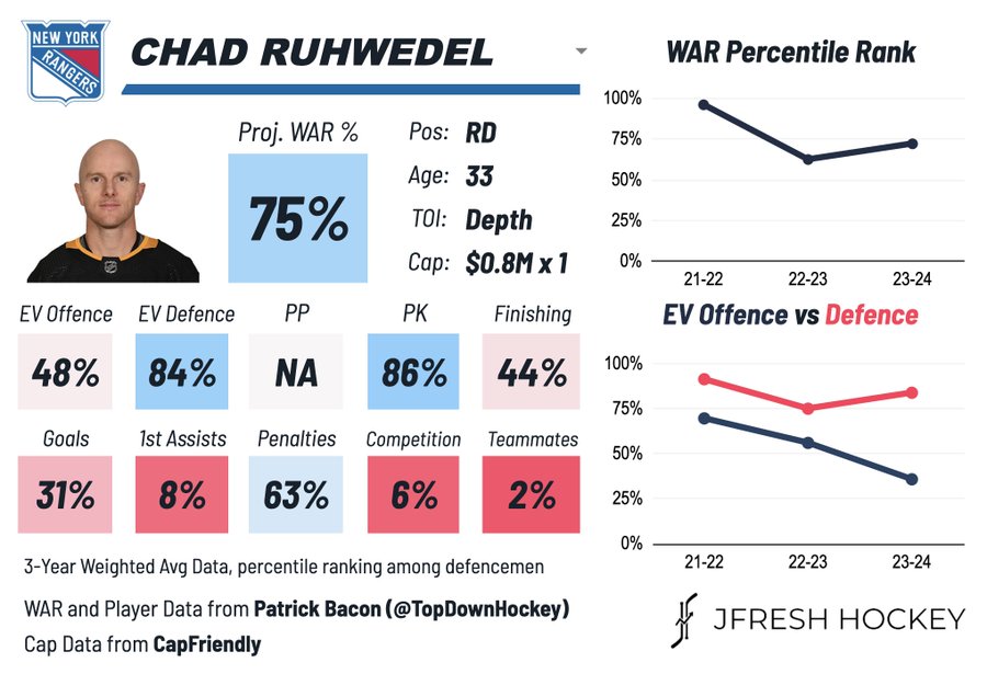 While neither player moves the needle much for the 2024 Rangers, good organizational depth is important to have as injuries can strike at any time. Ruhwedel’s arrival is particularly timely as captain Jacob Trouba will be injured for the next 2-3 weeks after getting banged up against the Panthers. Hopefully we don’t see much of either of them, because with all due respect to them, that probably means someone is hurt pretty bad.