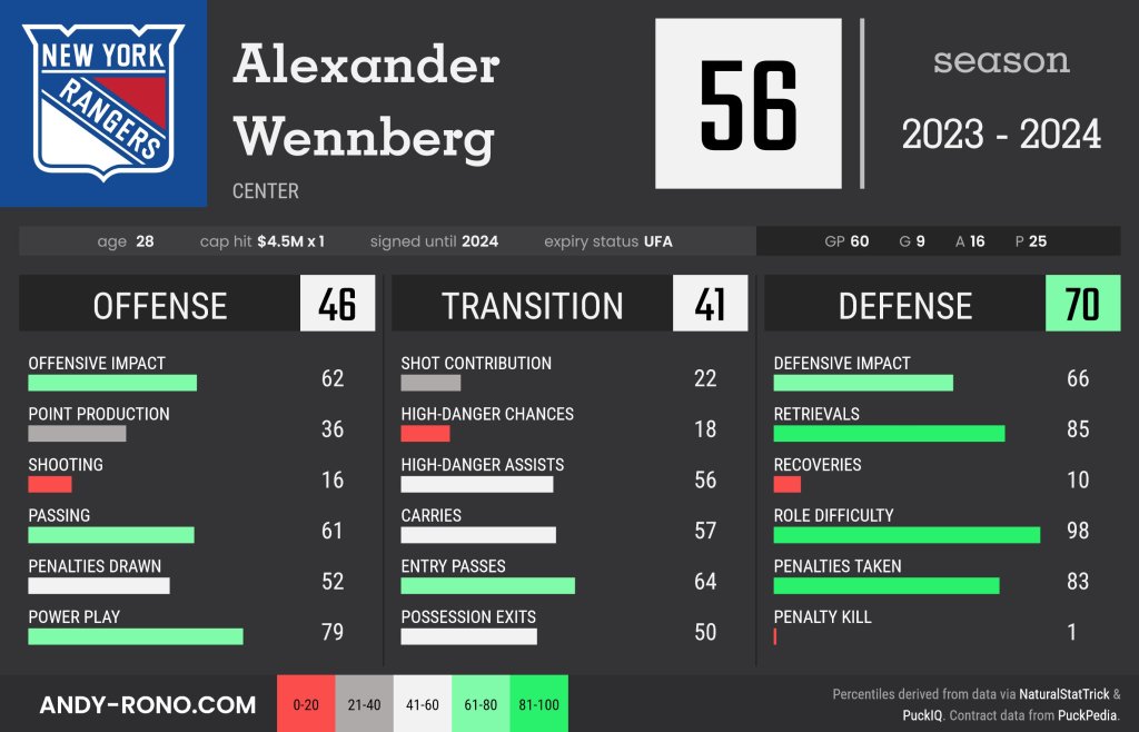 Don’t let his defensive and pass first tendencies fool you though, Wennberg has plenty skill which makes him a threat to contribute in pretty much any setting. While he has just 25 points (9 goals and 16 assists) in 60 games, the 29-year-old should be able to do good work for this Ranger team in a lot of areas. Similar to Roslovic, the majority of his production has come at even strength. Much like Andrew Copp at the 2022 deadline, Wennberg’s analytics profile well as a good fit for this team, especially considering the checking role they’ll have him playing, though he has the flexibility to play further up the lineup as he played with Artemi Panarin in Columbus.