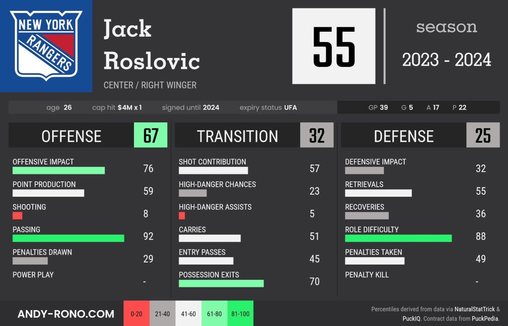 While on the surface his offensive numbers aren’t overly impressive, a closer look paints a better picture of late. Number 96, the first Ranger to wear the number since Emerson Etem, has 13 points in his last 12 games and perhaps the jump from the basement to the penthouse of the Metro division can continue that momentum. Perhaps even more important is that the majority of his projection this year has come at even strength, an area where the Rangers struggle at times. It seems he’ll get a crack at playing with Chris Kreider and Mika Zibanejad, much in the way that Frank Vatrano did in 2022. While I’m not big on analytics, based on his metrics this season, Roslovic profiles quite similarly to the game Vatrano brought that spring.