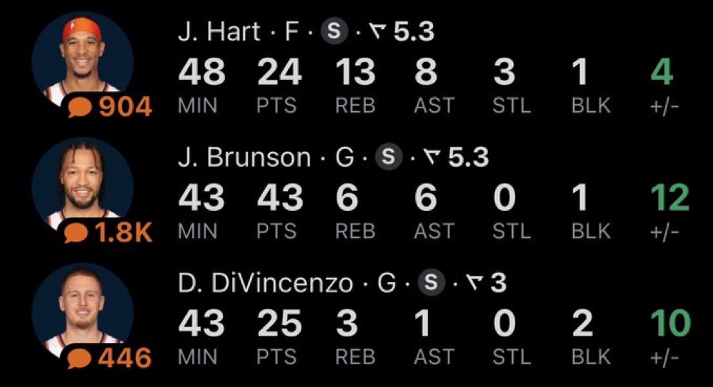 The good news is, the Knicks did all of that wrong yet they still managed to win the game. That comeback effort was led by the Villanova trio, as Divo, Hart and Brunson were outstanding while putting in iron man performances. As the graphic above shows, they played virtually the entire game and accounted for a huge chunk of the Knicks offense. These three along with Isaiah Hartenstein and OG Anunoby continued to make clutch plays down the stretch that electrified the Garden.
