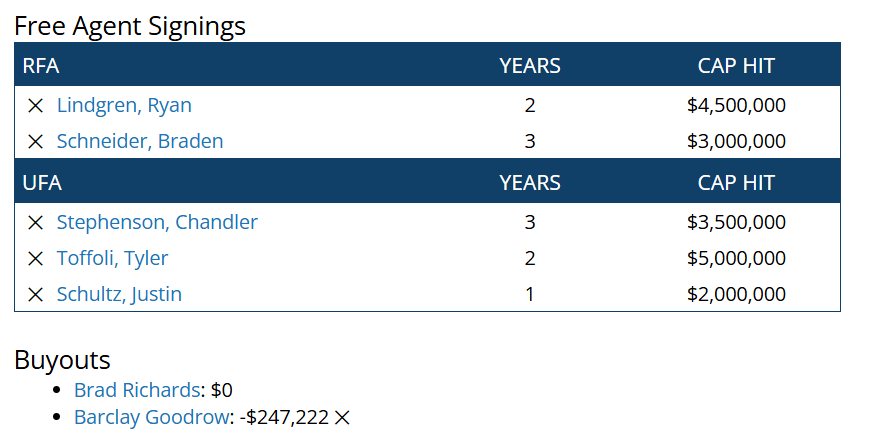 Now that I’ve walked you through the plan, let’s put our GM hat on and dive in the moves I elected to make using Capfriendly’s roster simulator. The site is truly fabulous and it’s a shame to see it being shut down after the draft, as it was acquired by the Washington Capitals to be employed by their front office. The fact that they along with other NHL clubs don’t already have the infrastructure in place to properly operate and the commissioner’s office is happy that this wonderful fan resource is going by the wayside is terrible. Capfriendly and sites like it cater to fans and their love of the game, the most diehard fans in the world like to know the player salaries and make moves in their own mind that replicate what goes on in the league. Celebrating a lack of engagement is a bold strategy, Gary. Anyway, I’ll get off my soapbox, let’s get to work on the roster.