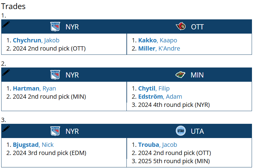 In looking at the trades I made first I was looking to bring in a player with a similar frame and upside to K’Andre Miller, but in the person of a player who brought more physicality to the role. Jacob Chychrun represented that in my mind and while he also has 1-year left, I feel this would be a worthy roll of the dice for the blueshirts while moving Kakko nets them an extra pick that I would flip later. Chytil for Hartman is purely about styles and finding a player better suited to a bottom six role, Hartman is exactly that and then some, as I feel Ranger fans would fall in love with him. Of course, the final one is perhaps the least realistic as it assumes Utah would want Trouba at most if not all of his salary, and he would accept a trade there. Big Nick Bjugstad coming the other way is a move to fill a hole created by a later transaction.