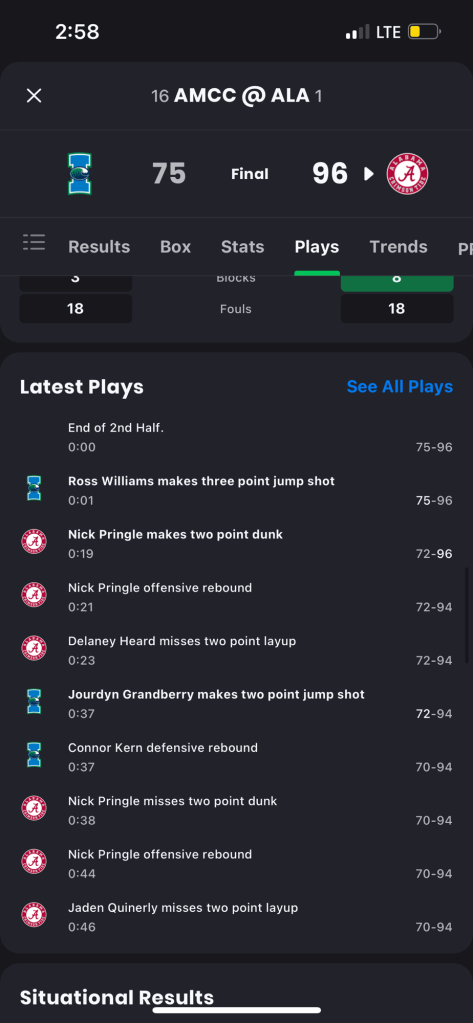 The year is 2023 it’s day one of March Madness. Obviously there’s a lot on the line. Picks, brackets you’re going through the ringer. I bet #1 seed Alabama -23.5 against 16th seeded Texas A&M CC. It was a back and forth affair spread wise but with about 20 seconds left Nick Pringle throws down a funk to make it 96-72. The shot clock is off and the A&M CC guard is dribbling out the clock. It’s over, right? Wrong. Another player named Ross Williams sprints over and takes the ball from his teammate. He drives and throws up a 3 from the wing… bang it’s good Bama wins 96-75. I honestly went back and looked at the series of events to make sure I wasn’t embellishing and I didn’t.