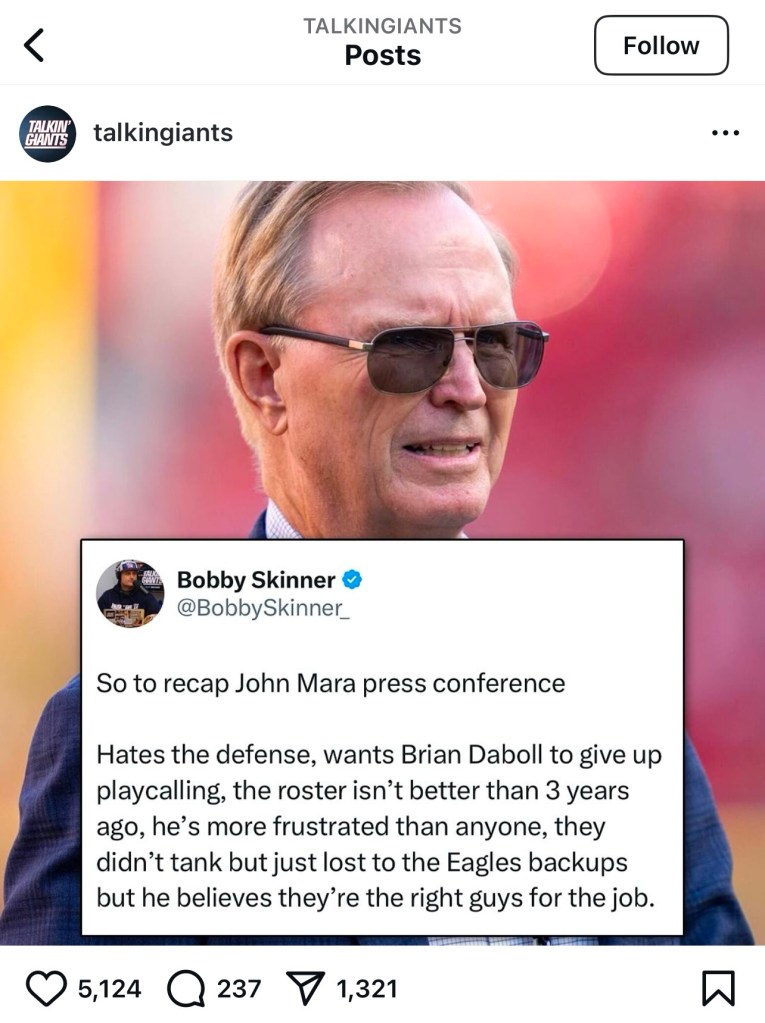 Mara’s end of season press conference was mostly just him telling the media how bad things are, while sitting next to the two people most responsible for the mess he was referring to, whom he was not firing. Brian Daboll and Joe Schoen started their tenure’s brightly but to say things went south in the last two years is an understatement. Daboll is a far cry from the swaggering leader he was in year one, a year where his bold convictions bred a winning culture and got the Giants back to the playoffs with a 10-7 record and Wild Card round win over the Vikings. That identity has given way to having…no team identity at all. The Giants aren’t hard to play against in the trenches, flashy at the skill positions (outside of Nabers), or adequately prepared to play on a weekly basis. Quite the resounding endorsement of their leader.