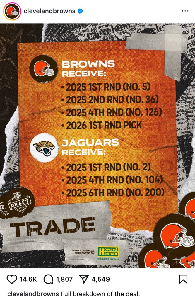 The Browns front office did some sharp work here. Not only did the 5th pick this year become Mason Graham, the best defensive tackle in the class, but they also managed to get a first next year. They’re loading up on assets as the roster is in flux this year with their QB injured. Expect them to add a vet QB in a trade (cough Kirk cough) and maybe a young guy on day 2 or 3. They have two picks at the top of the second so they have a chance to really get after it. The conundrum will be that they passed on picking the dynamic Travis Hunter but only time will tell if this all works out for the Jags.