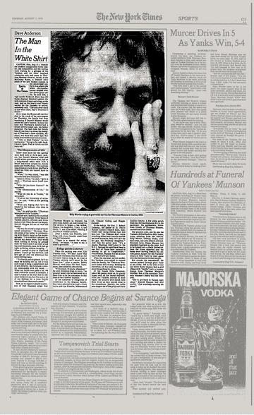 This game and the events around it have always held a significance to me as a Yankee fan. My mom, a die hard Yankee fan herself, celebrates her birthday on August 2nd. Meanwhile my father’s two favorite Yankees of all time are our central characters, Thurman Munson and Bobby Murcer. I get him a new Munson shirt every few years so he can keep “his Yankee” close to his heart, and he is always moved emotionally on Old Timers Day when Kay Murcer, Diana Munson and Jill Martin (wife of Billy Martin) make their way on the field on Old Timers Day.