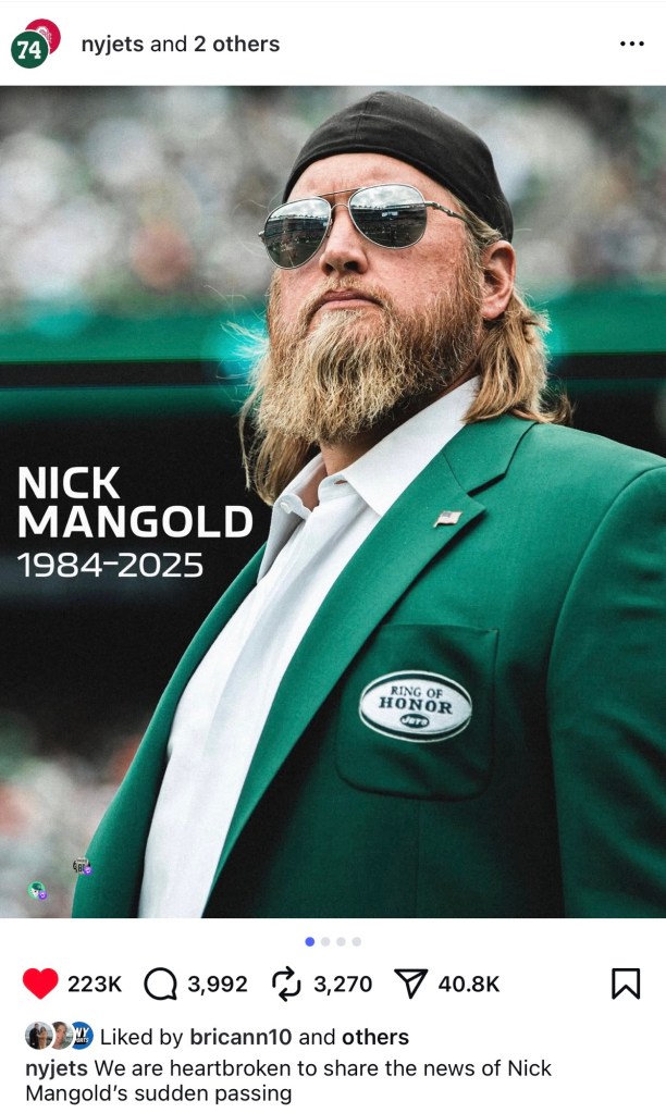 I essentially saw all of Mangold’s career with gang green, and went to many of the games he played. And play he did, game after game, year after year. Number 74 was a leader and warrior in the trenches, and a tone setter in the room. He was the heartbeat on the best teams the Jets have had since the turn of the millennium, and always comported himself well off the field. He was good with the media, and even more run out on the town, like when he cheered for the Rangers during their 2010’s playoff runs. He was a Buckeye by birth, but he was also a New Yorker and above all a Jet. May he rest in peace and our thoughts and prayers go to his family and friends.
