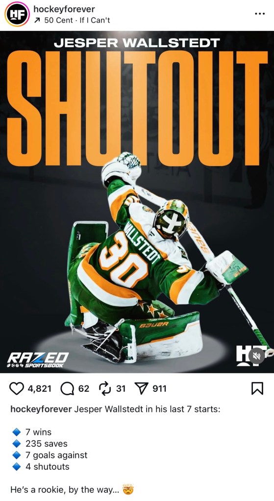 Brick Wallstedt: We begin in the state of hockey, where the Wild have climbed to standings to third place in the central thanks to the man in the pipes. Rookie netminder Jesper Wallstedt has been out of this world good of late. In number 30’s last seven starts he’s 7-0 with just seven goals against and four shutouts. For years Minnesota has had trouble getting consistent goaltending, which has held them back from winning big in the playoffs. But with Wallstedt finally delivering on his draft promise and Filip Gustavsson sporting a GAA of 2.74 himself, this tandem can take the Wild a long way!